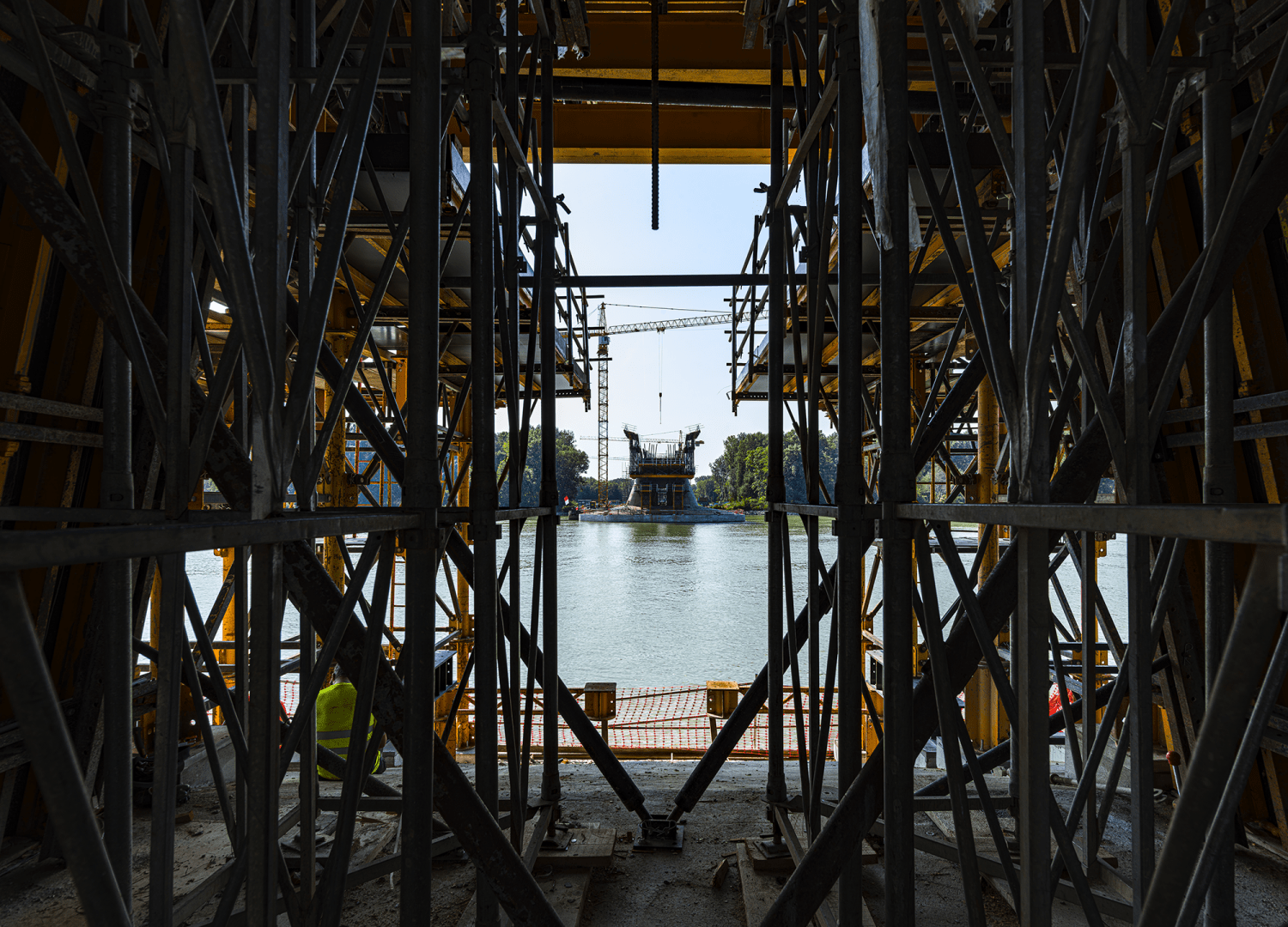 South of the Slovakian capital, the Danube River widens, branching out and reclaiming its strength as if never diminished. There, a viaduct sits atop it, a metallic crown shading it just a bit.