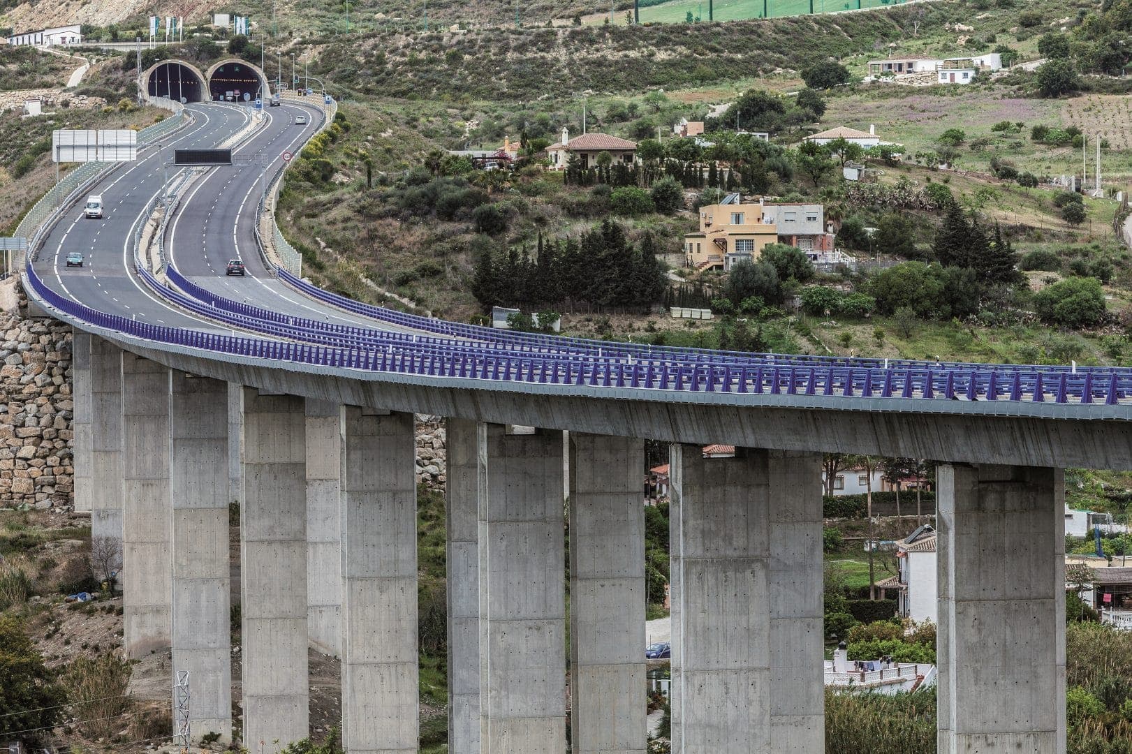 Though it runs along the coast, the highway has to navigate the capricious foothills of Malaga’s mountains for 105 kilometers. Its path isn’t very straightforward. To adapt to the landscape, the highway crosses 65 bridges and viaducts and runs through 10 tunnels in all. To improve visibility and safety conditions, Ausol also has a median measuring 12 meters wide. There are three lanes in each direction where traffic is the densest.