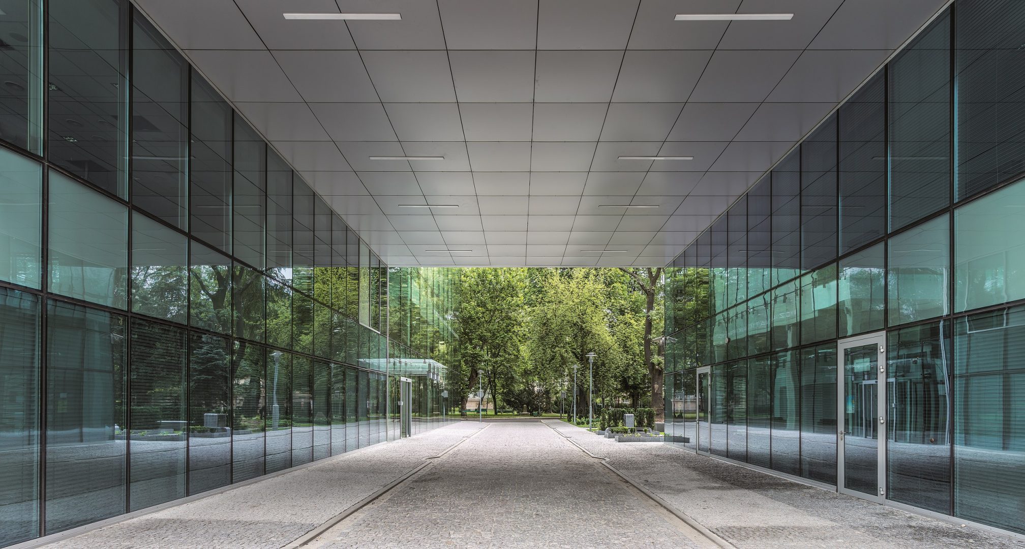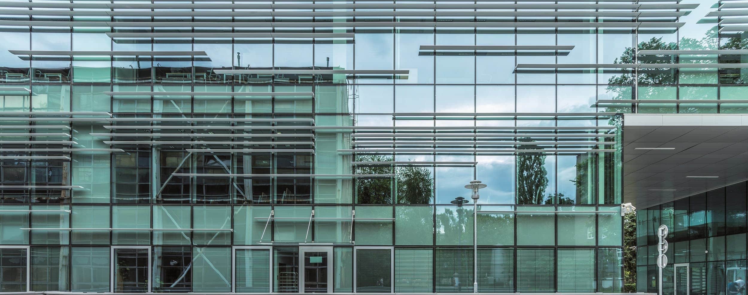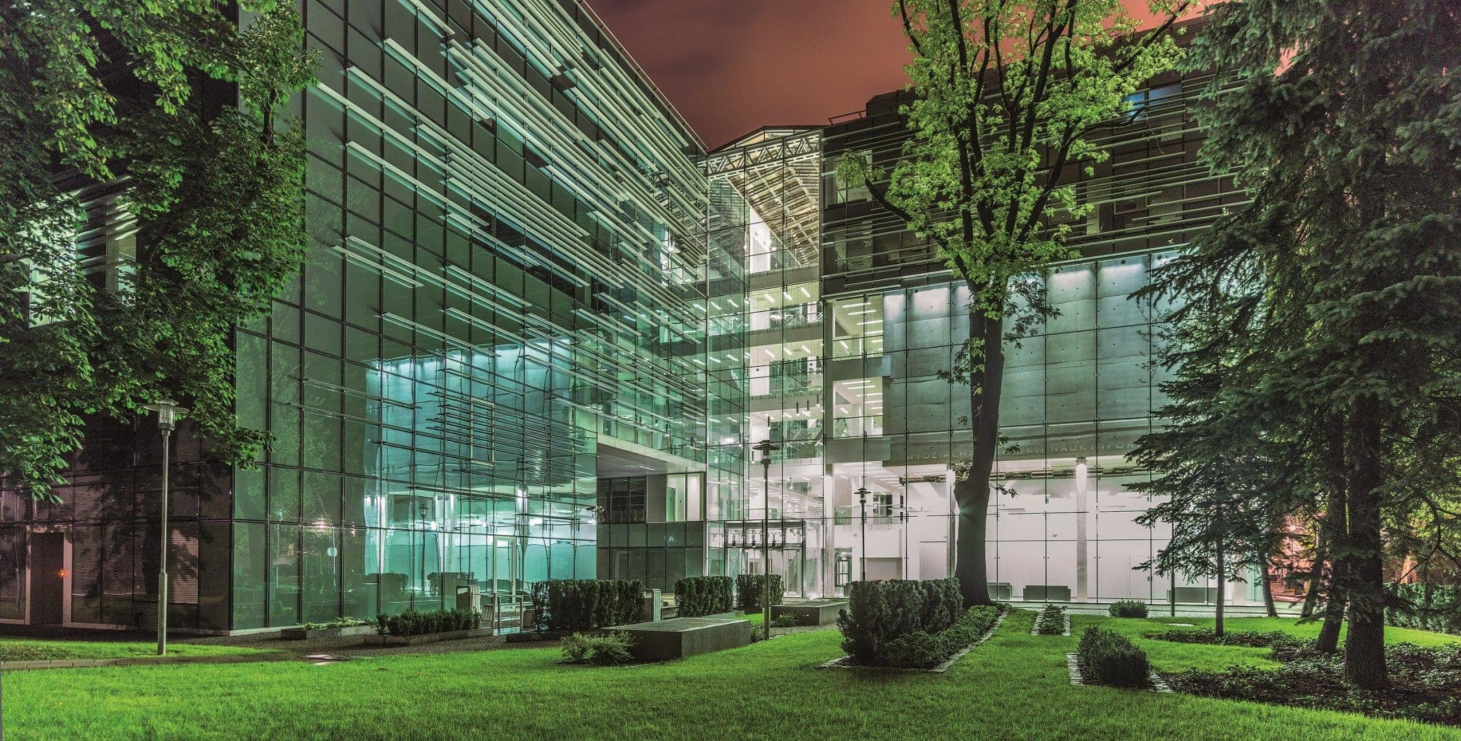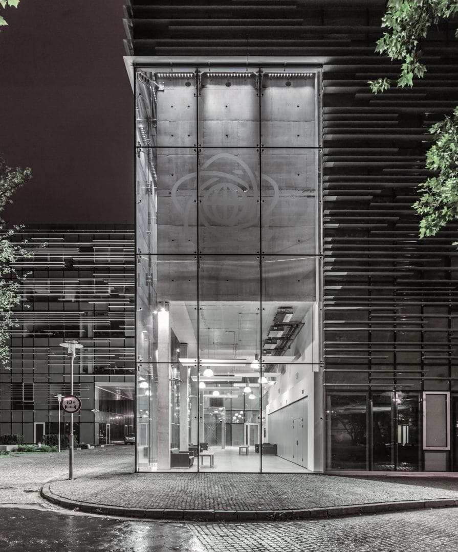 El edificio, construido por Ferrovial hace poco más de una década, se sitúa en el medio del campus de la Universidad Tecnológica de Varsovia. El cristal y la transparencia son los elementos predominantes en su fachada, dejando ver siempre el interior desde los alrededores y dando la impresión, desde dentro, de que uno se encuentra fuera.