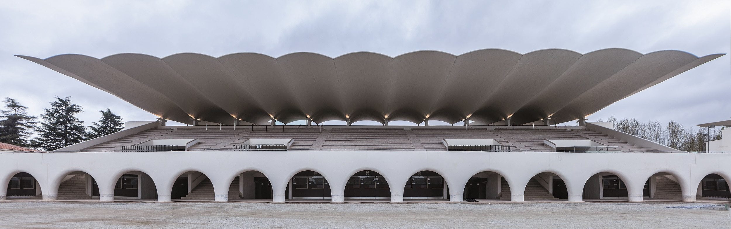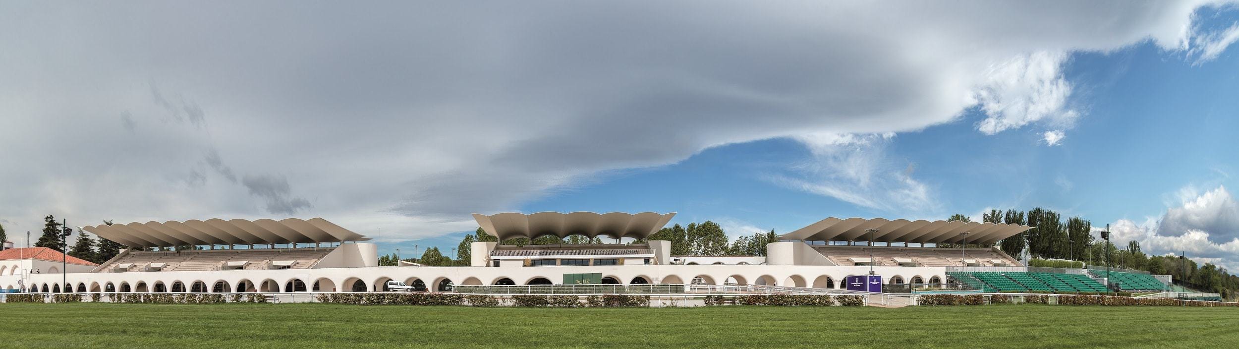 Corría el año 1935 cuando se puso la primera piedra del edificio. La construcción, concluida años más tarde por Agroman, hoy Ferrovial Construcción, terminaría dando forma a la primera tribuna volada sin columnas de España. Inspirado por el Hipódromo de San Siro, en Milán, Torroja Miret ideó una grada resguardada del sol y la lluvia por una cubierta de hormigón que parecía sostenerse en el aire sin necesidad de apoyos.