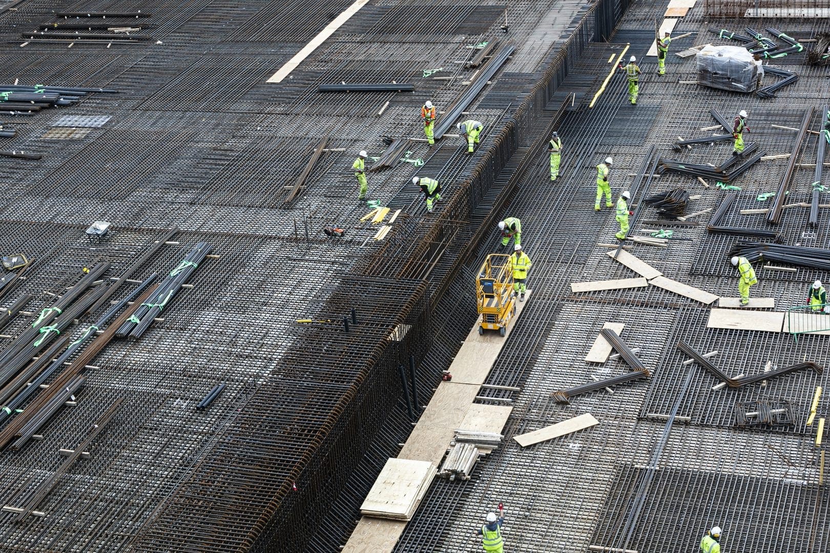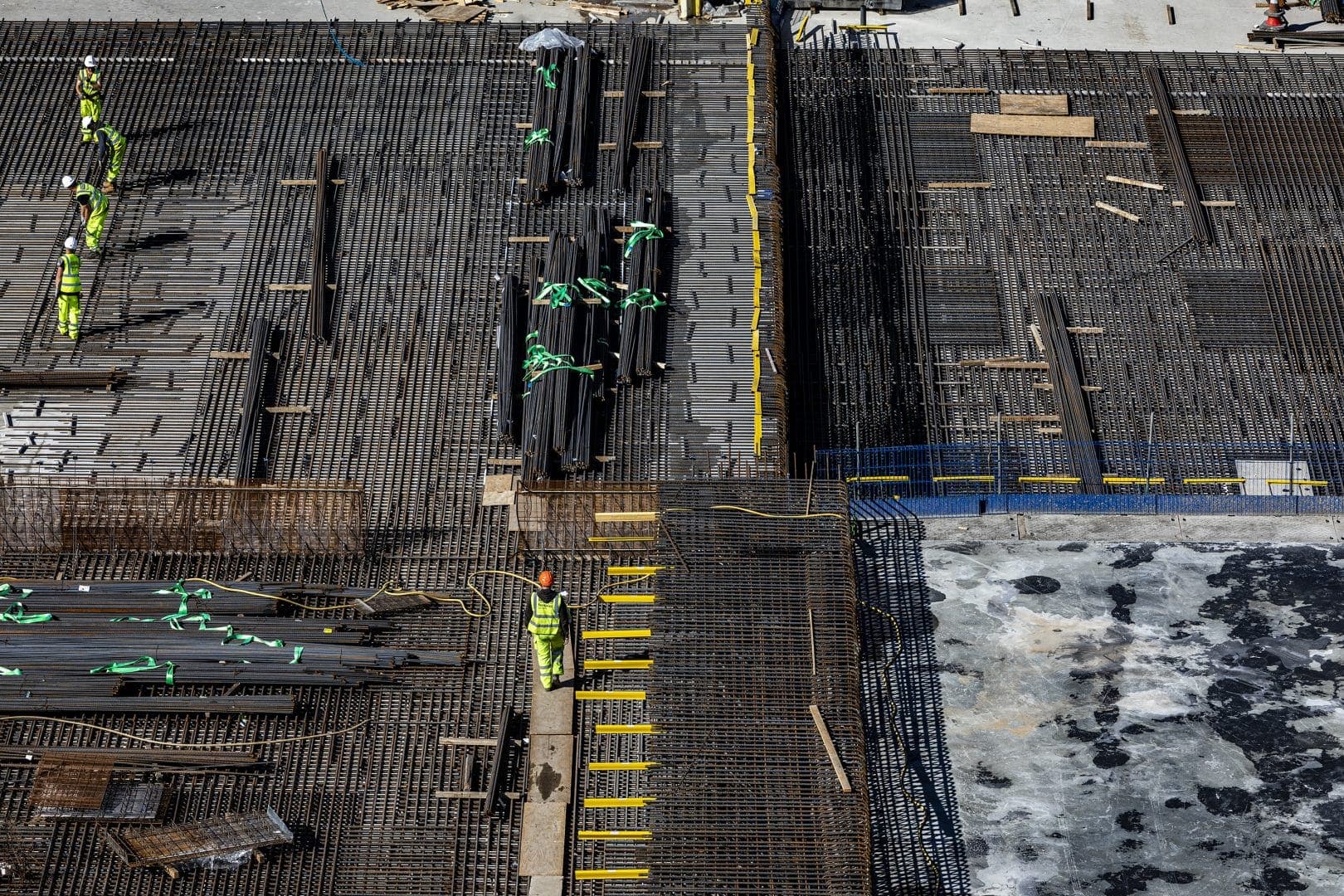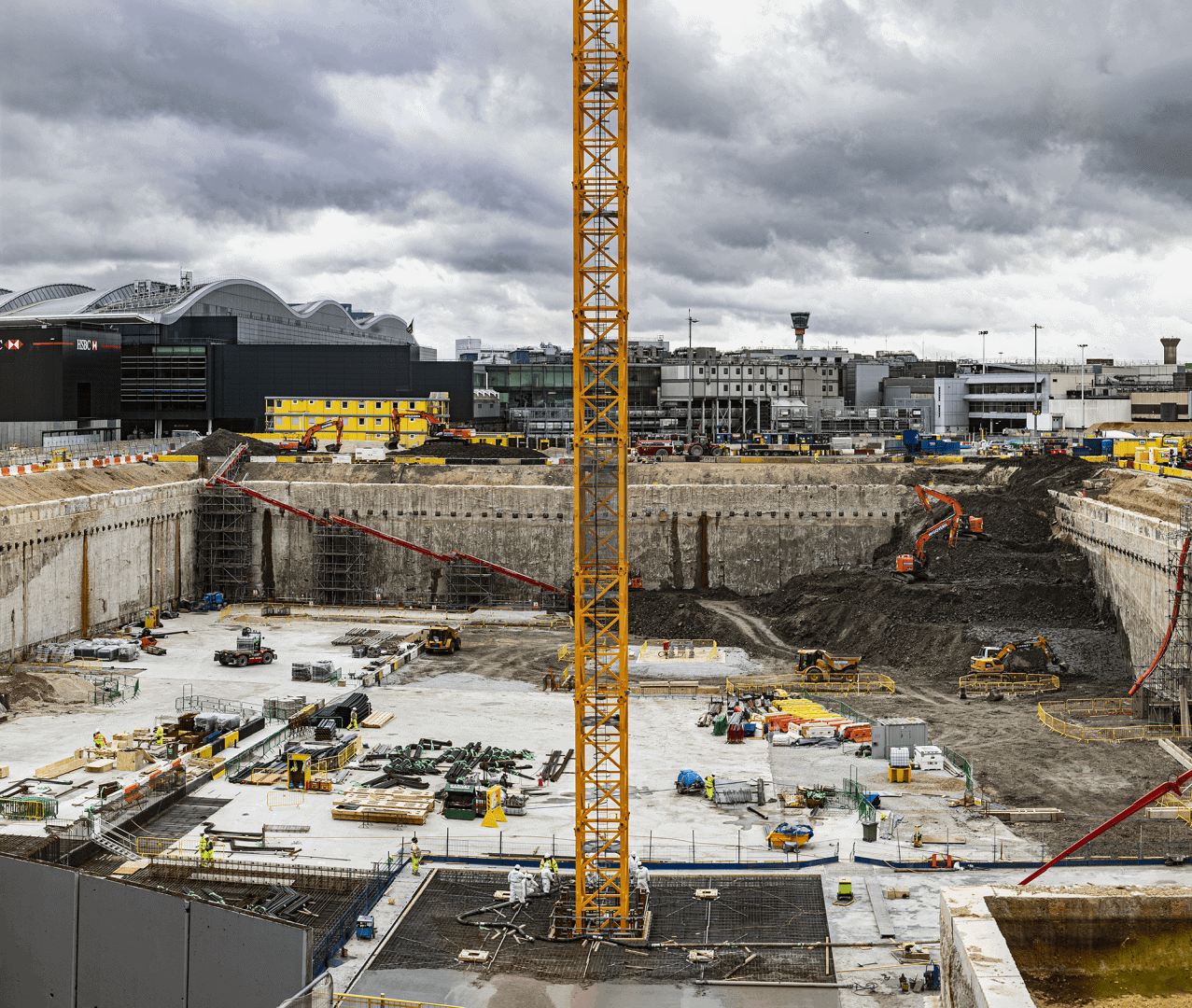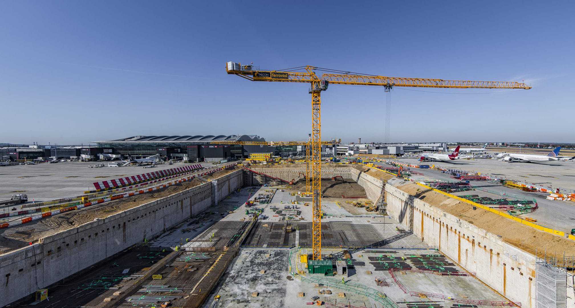 Bajo la atenta mirada del aeropuerto más transitado de Europa, el suelo se hunde para dar forma a una de las inmensas cajas de hormigón en las que descansan los aviones.