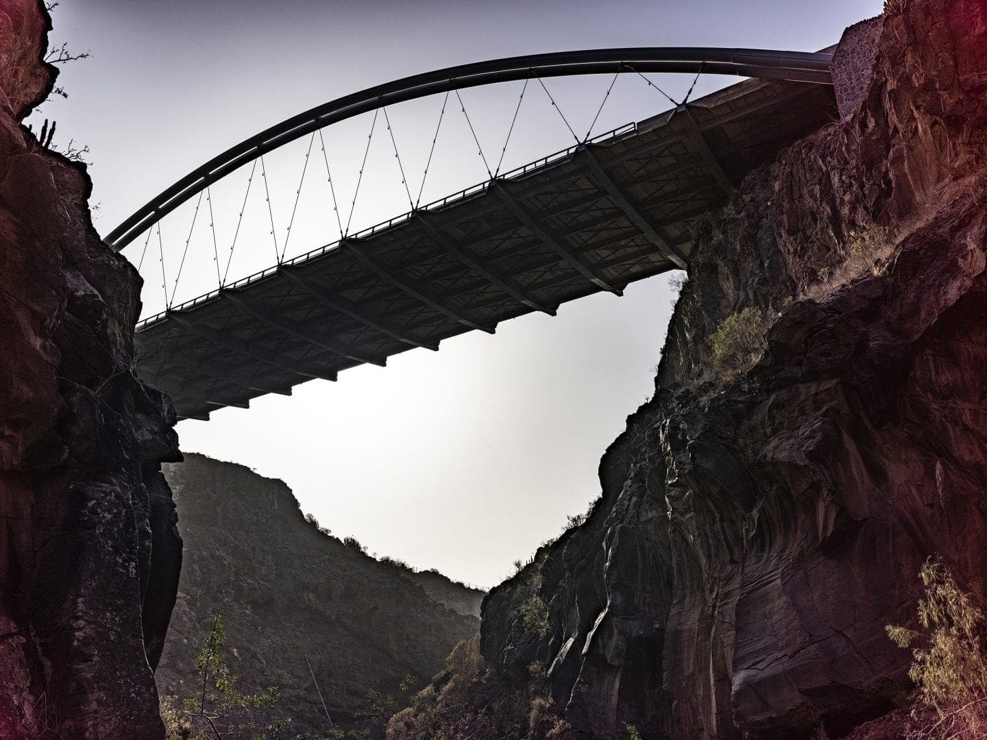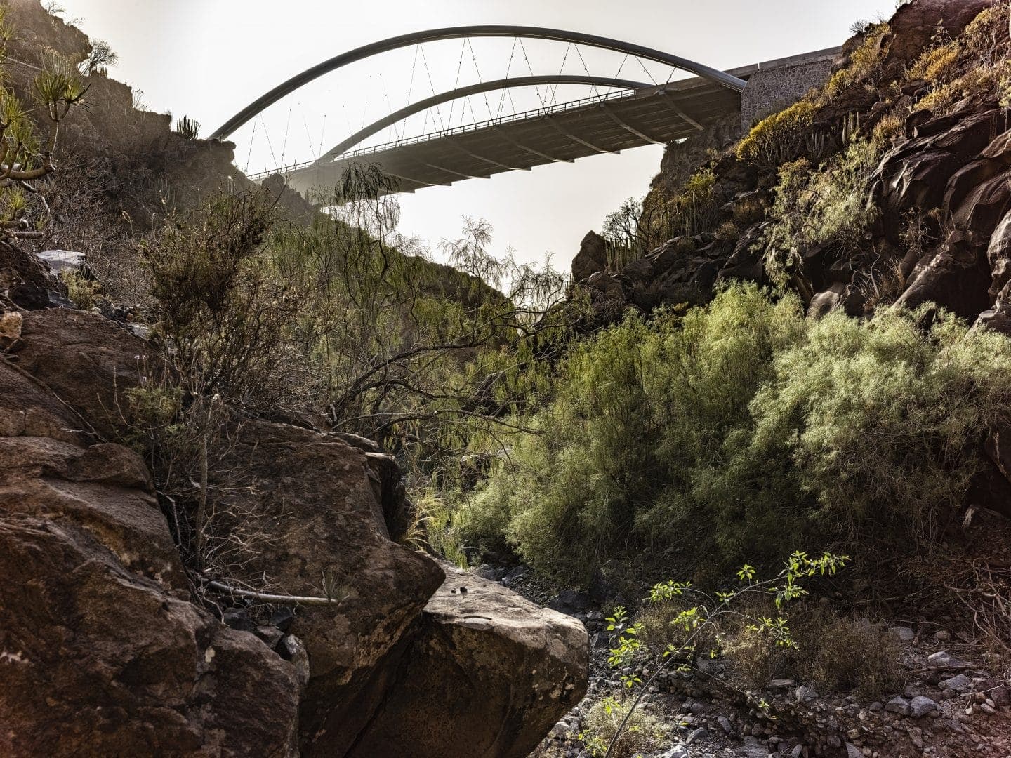 En el fondo del barranco, las rocas cambian de color. En función de las luces y las sombras del día son oscuras, brillan o se vuelven rojizas, recordando su origen en las entrañas de la tierra. Los verdes de las plantas destacan frente a las coladas basálticas que nacen de las cañadas del volcán. Allí abajo, el tiempo pasa tranquilo. El trajín de la vida queda reservado a las vigas y las péndolas que sustentan el viaducto del barranco de Erques.
