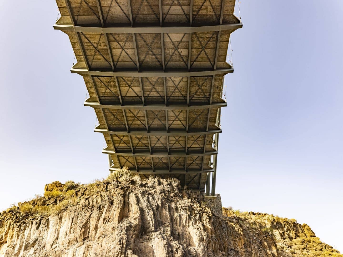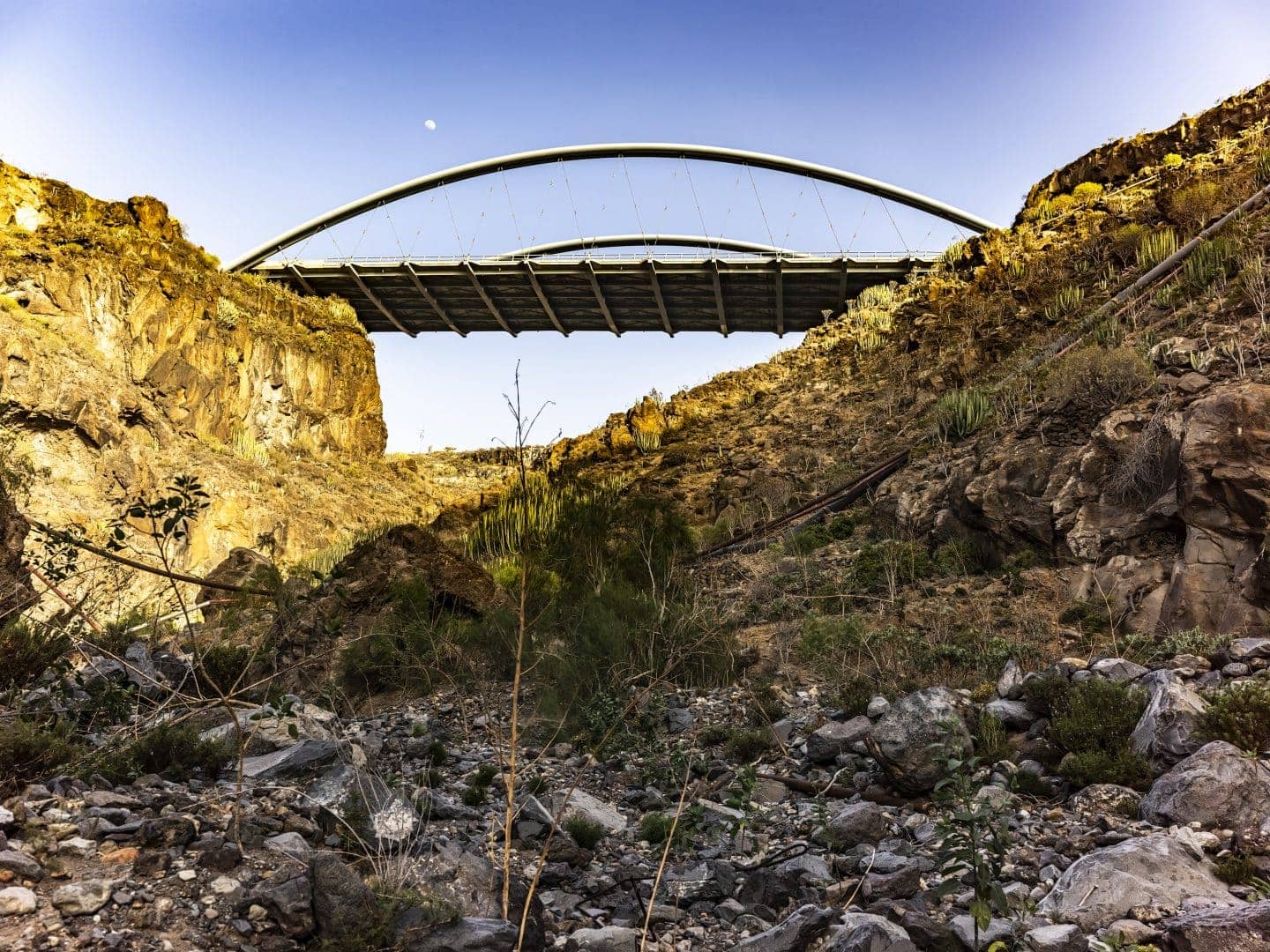 Ahora, un puente arqueado, suspendido en el aire, sobre el barranco de Erques, sobrevuela la historia de la isla de Tenerife. Observa, desde las alturas, los 13 kilómetros de una quebrada que es también hogar de plantas rupícolas, balos y tabaibas, y otras especies simbólicas de Canarias.